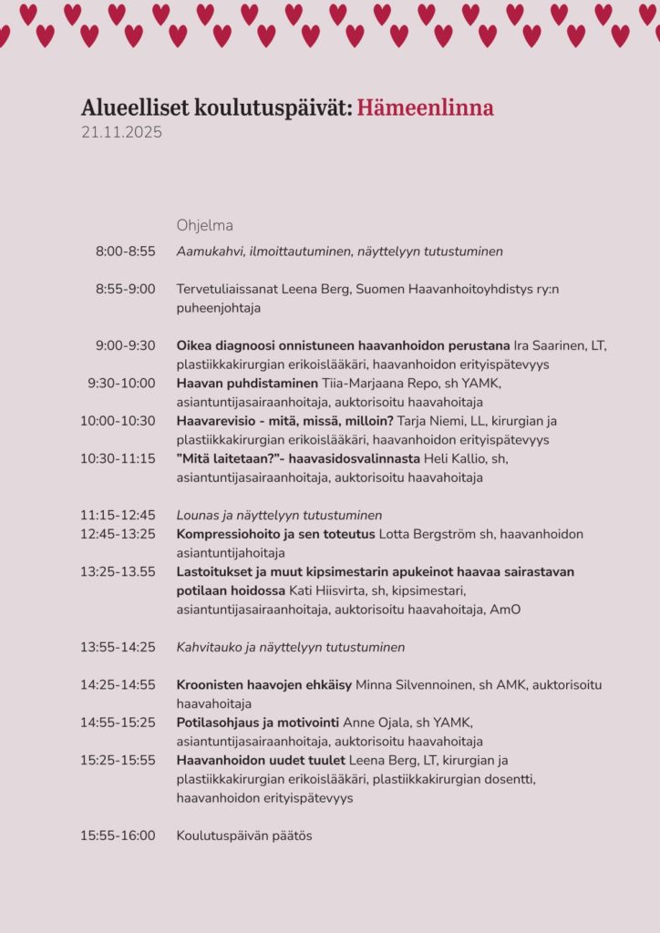 Suomen Haavanhoitoyhdistys järjestää syksyllä 2025 kaksi alueellista koulutuspäivää (live, ei etämahdollisuutta), Mikkelissä (31.10.2025) ja Hämeenlinnassa (21.11.2025). Teemana Diagnoosista hoitoon – haavanhoidon perusteita.